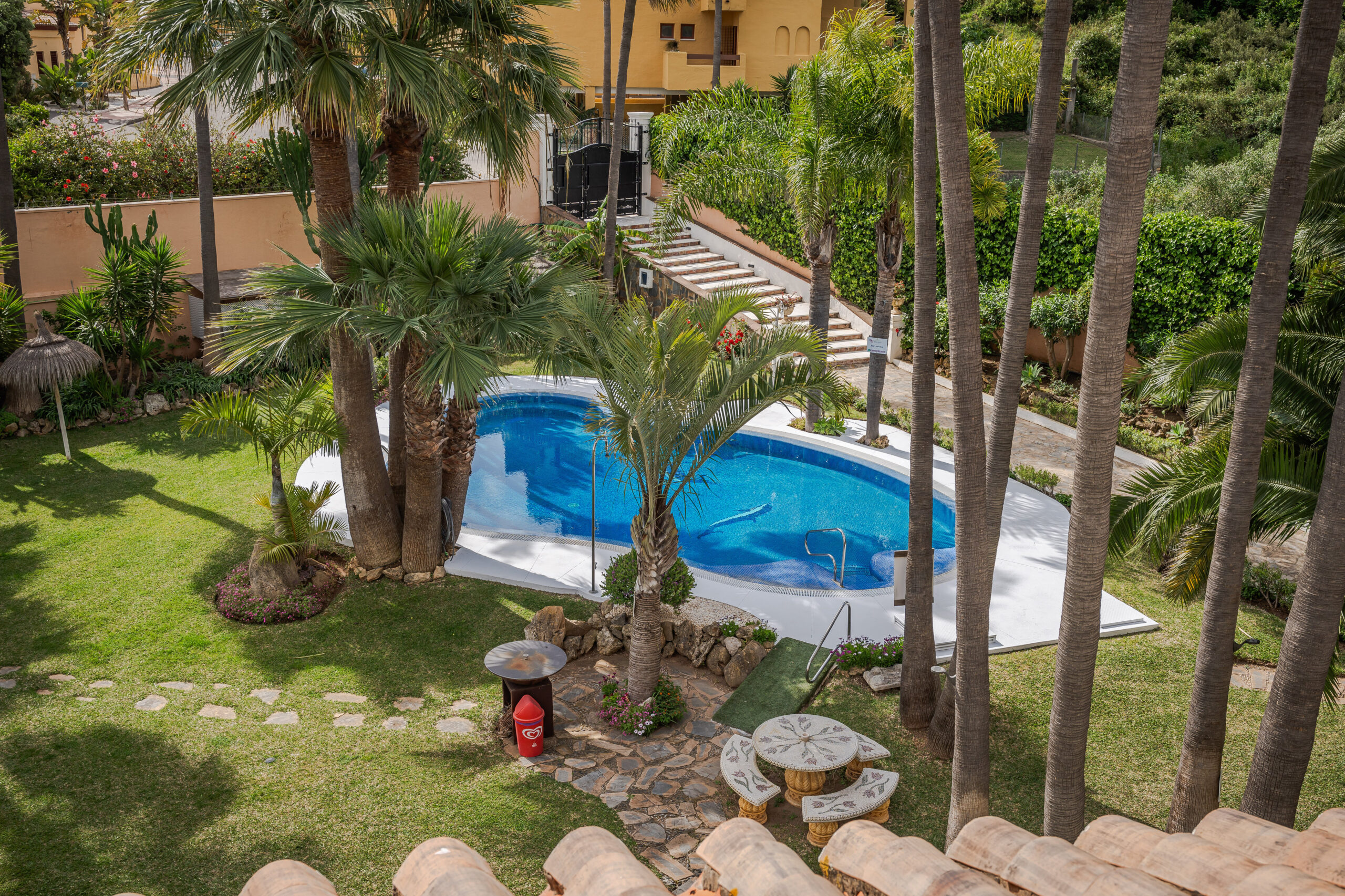 Our naturally salt based swimming pool is open for use all year round, surrounded by a beautiful walled garden, moreover we are lucky enough to have many fruit trees. The exclusive former boutique hotel facilities provide many lounges and communal areas for additional space for relaxation.
