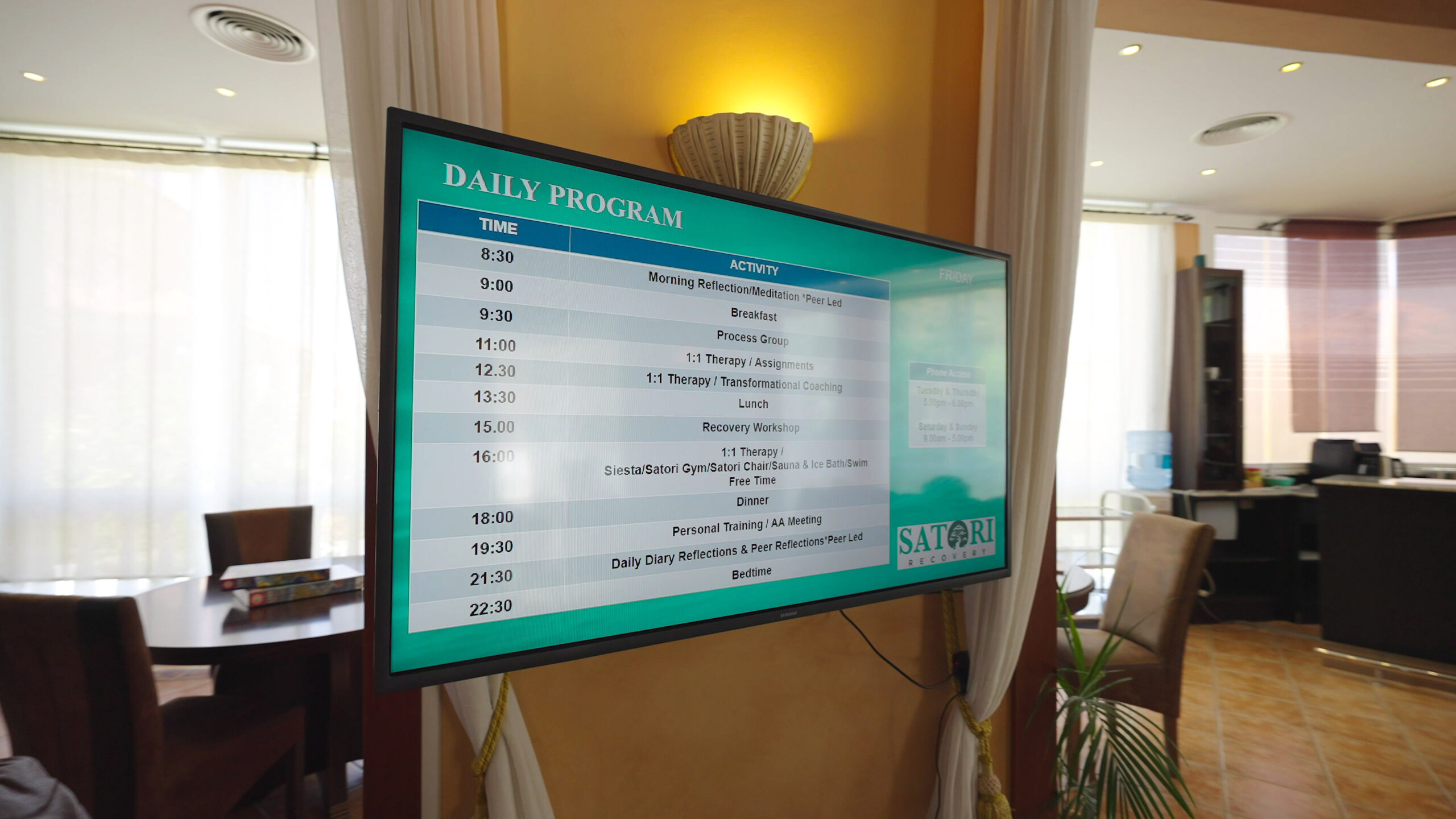 In our facilities, clients have access to Satori’s large and comprehensive collection of educational resources, including books and twice a week a movie night about recovery from alcohol and / or drug addiction.
